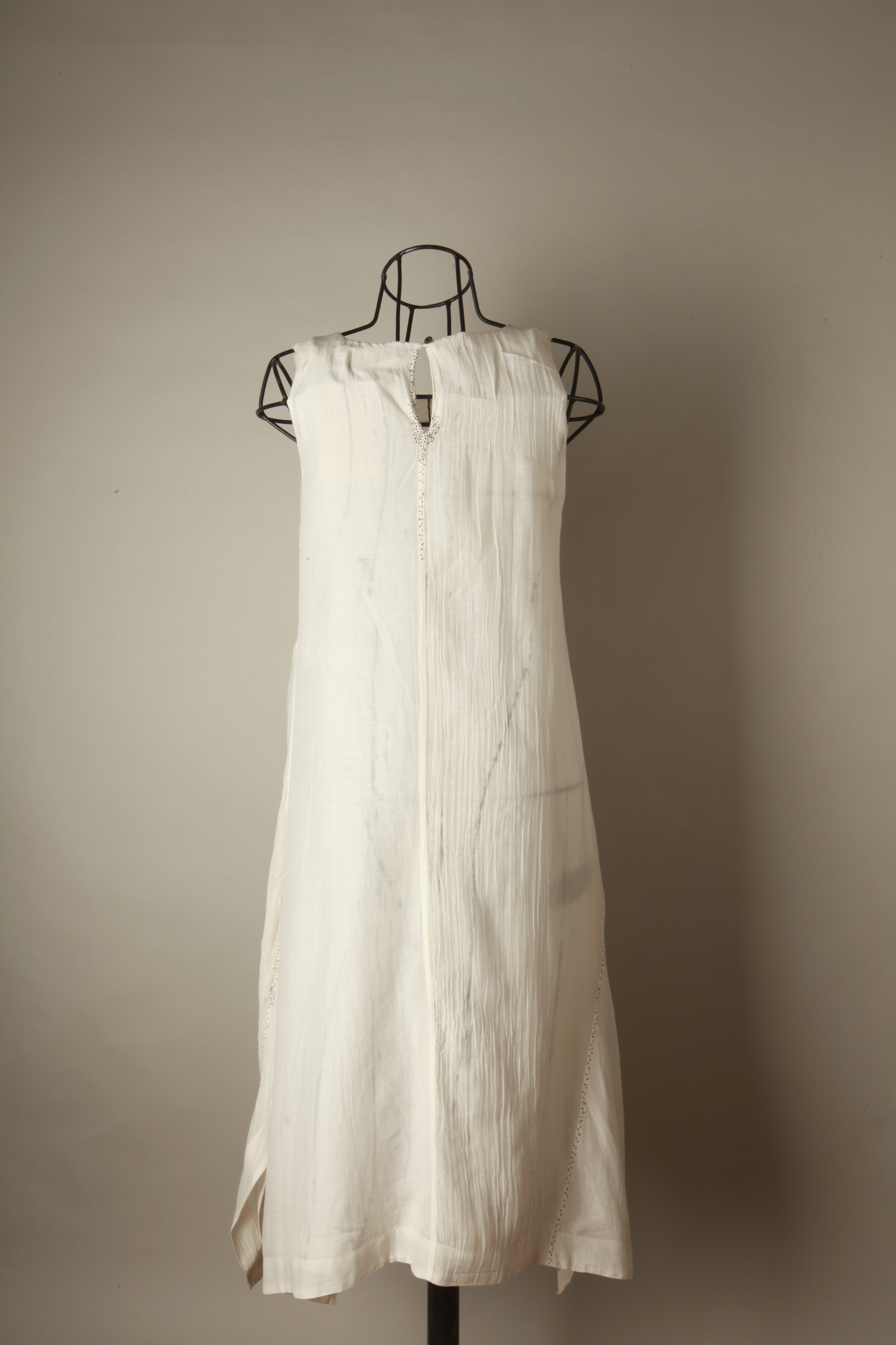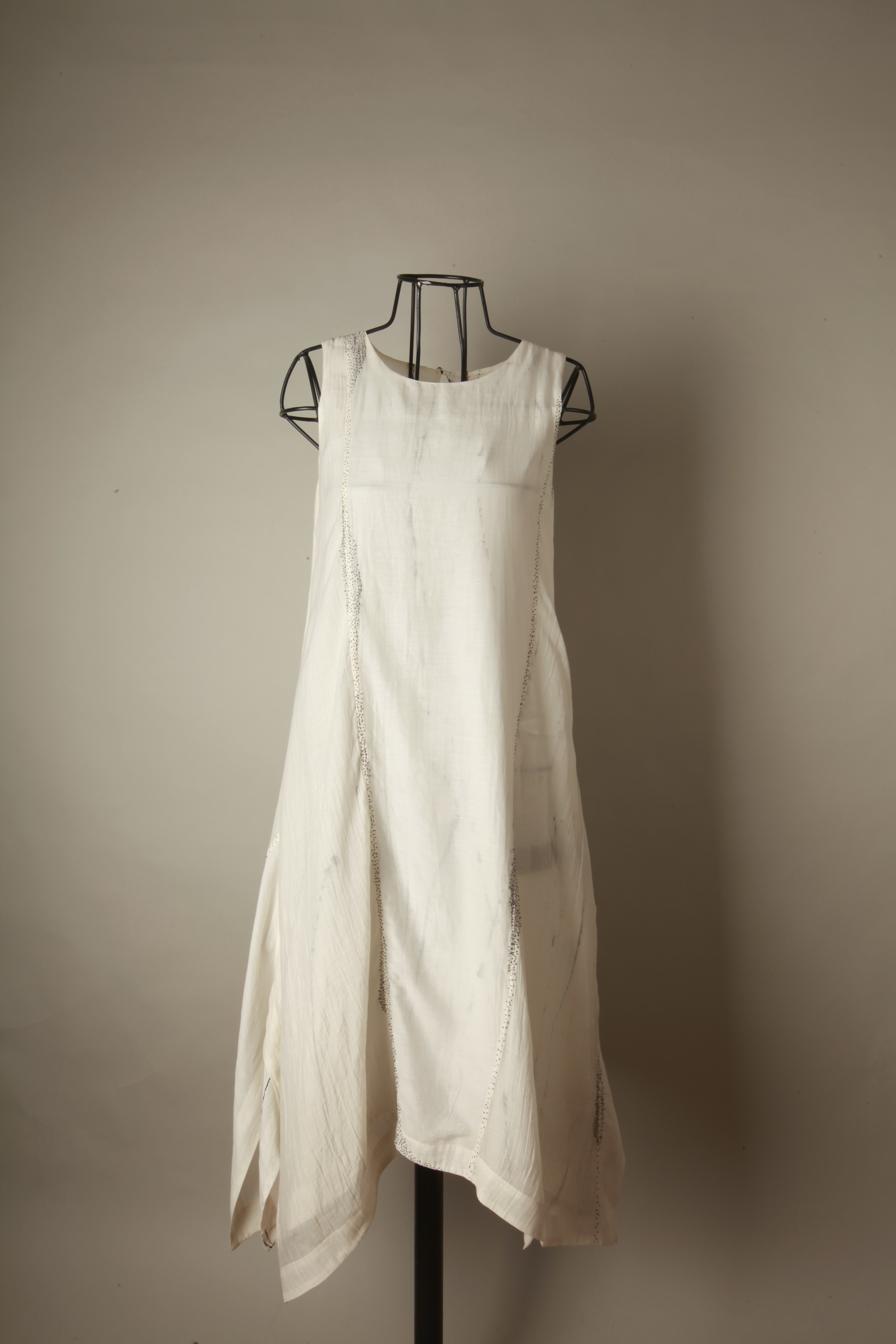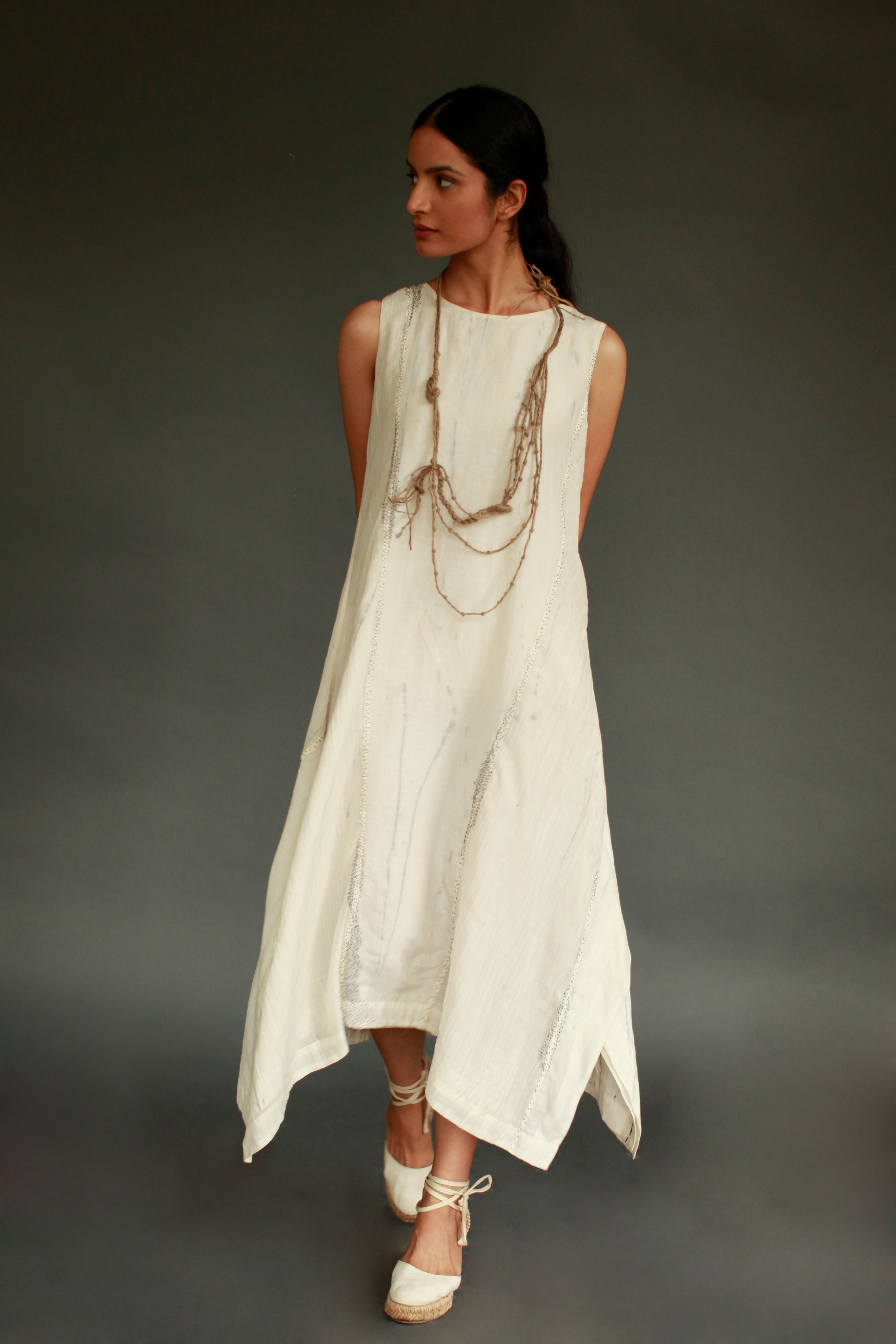 New Khadi, Layered and paneled avatar of our best selling Lounge Dress. Richly detailed with seeding stitch embroidery for a chic casual, evening look.
